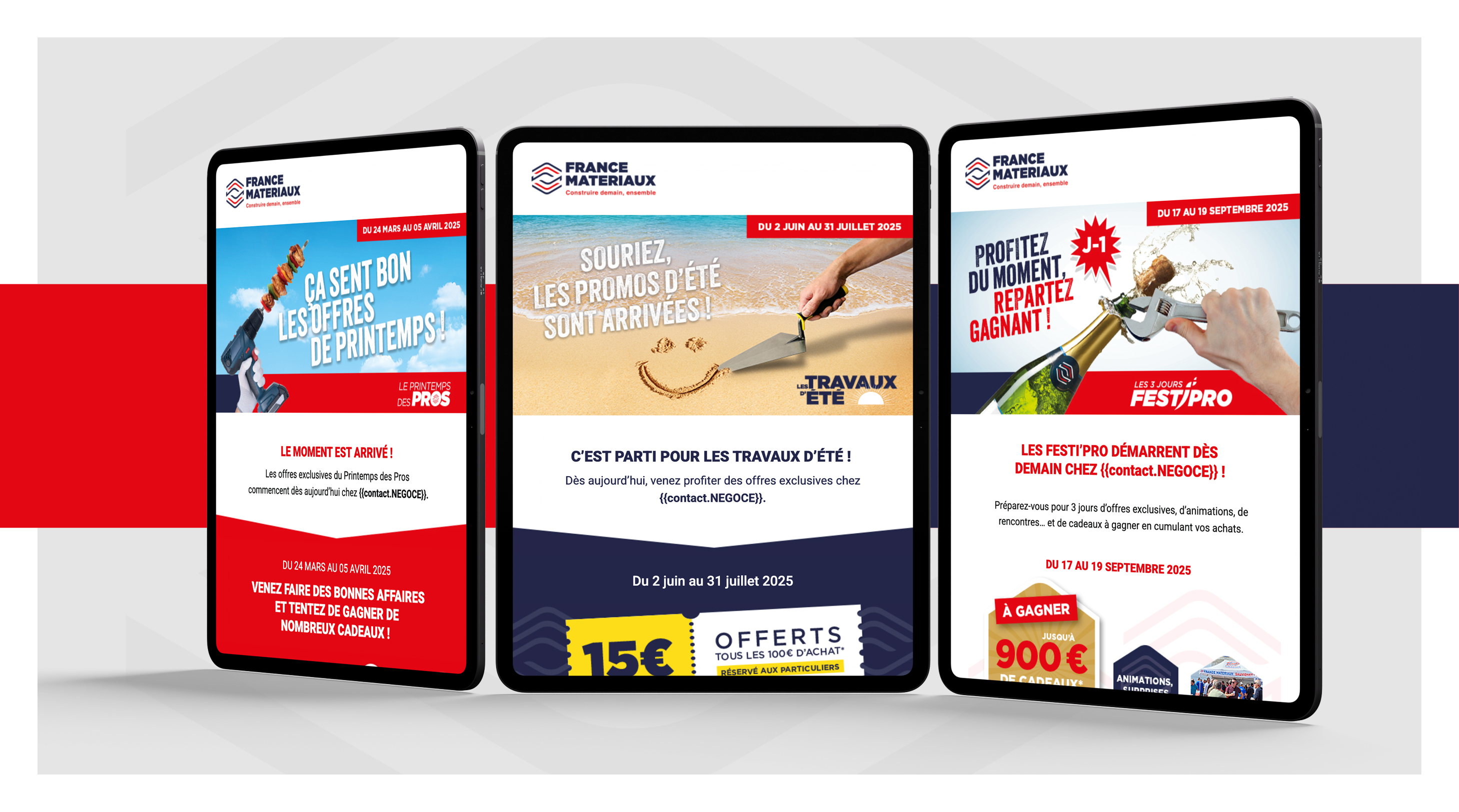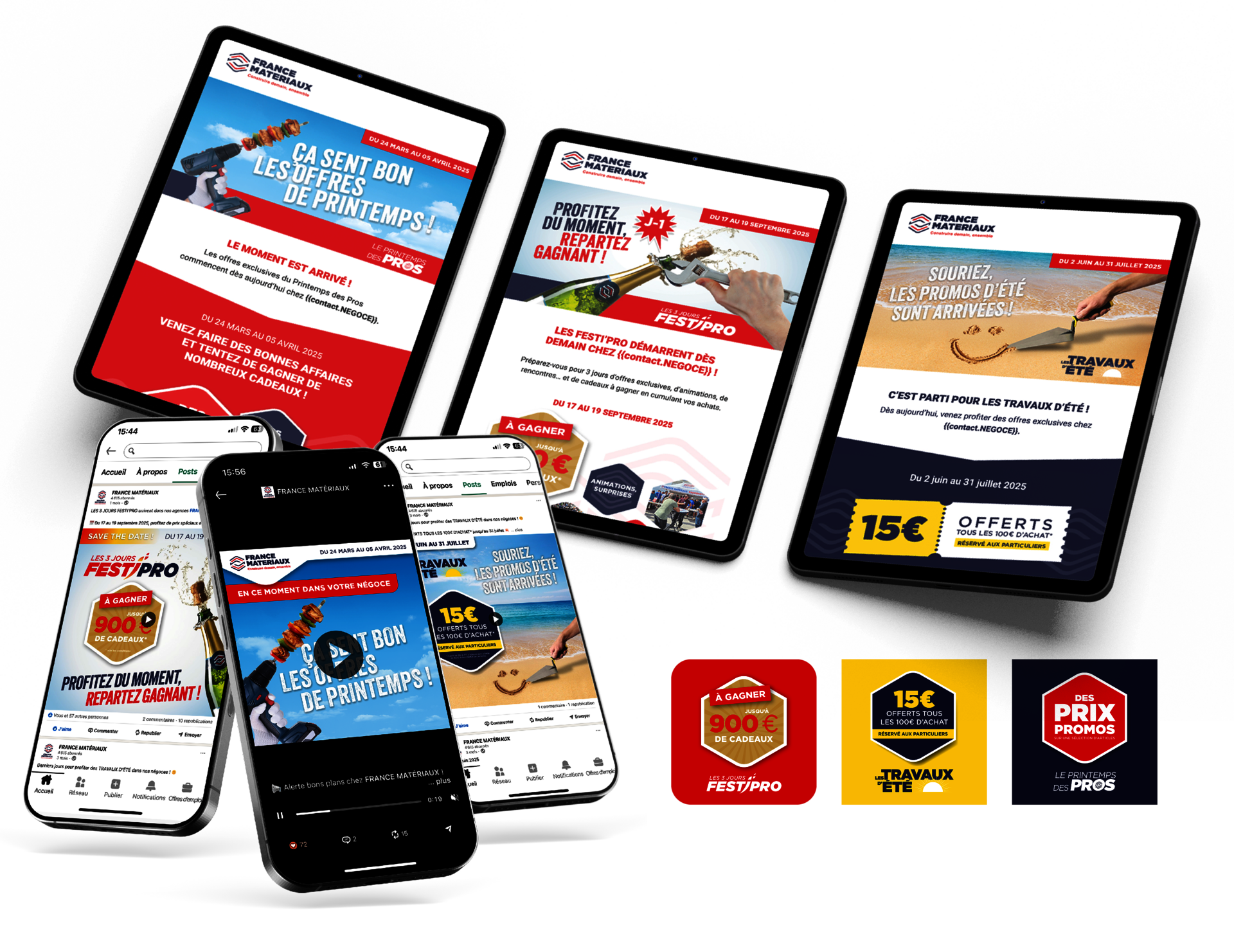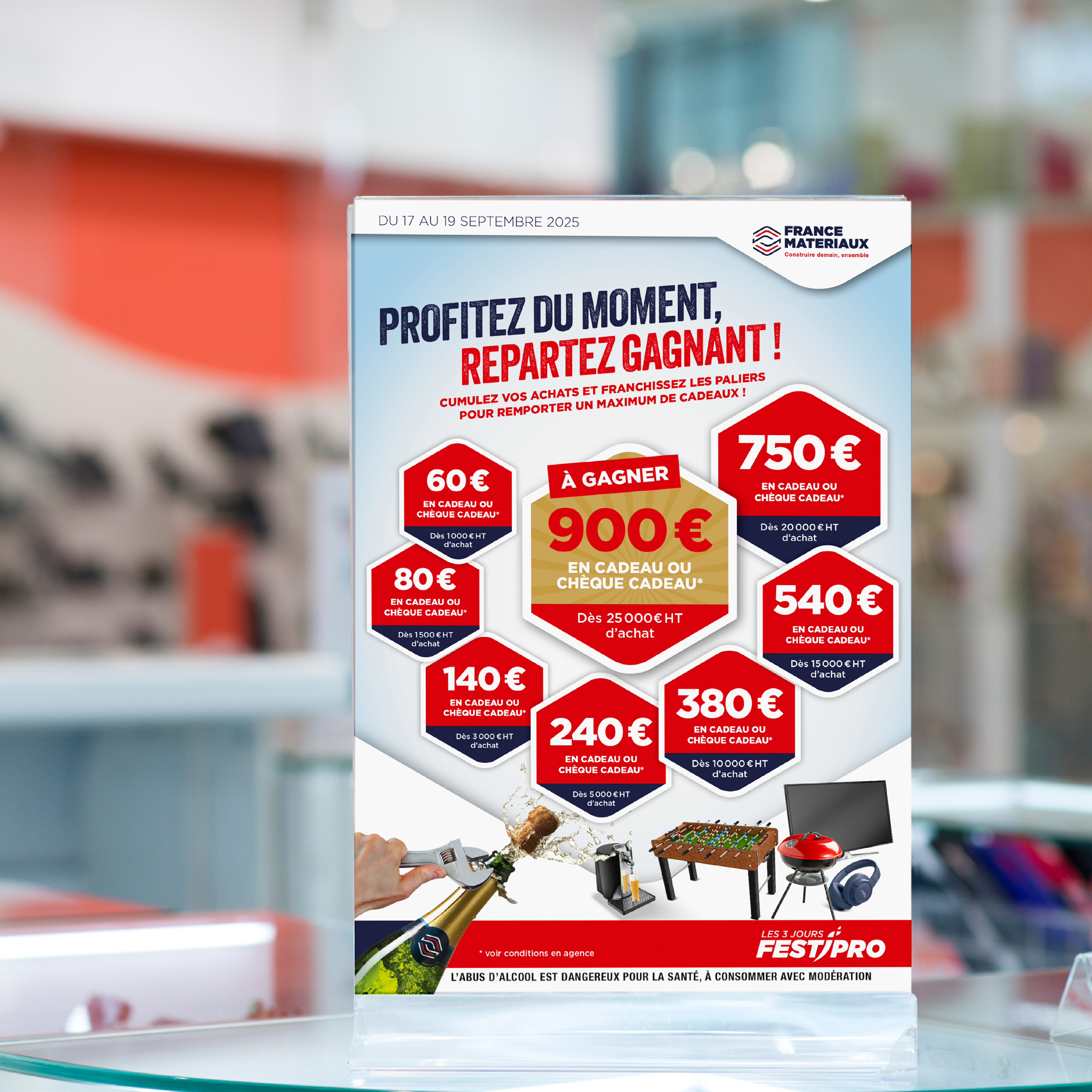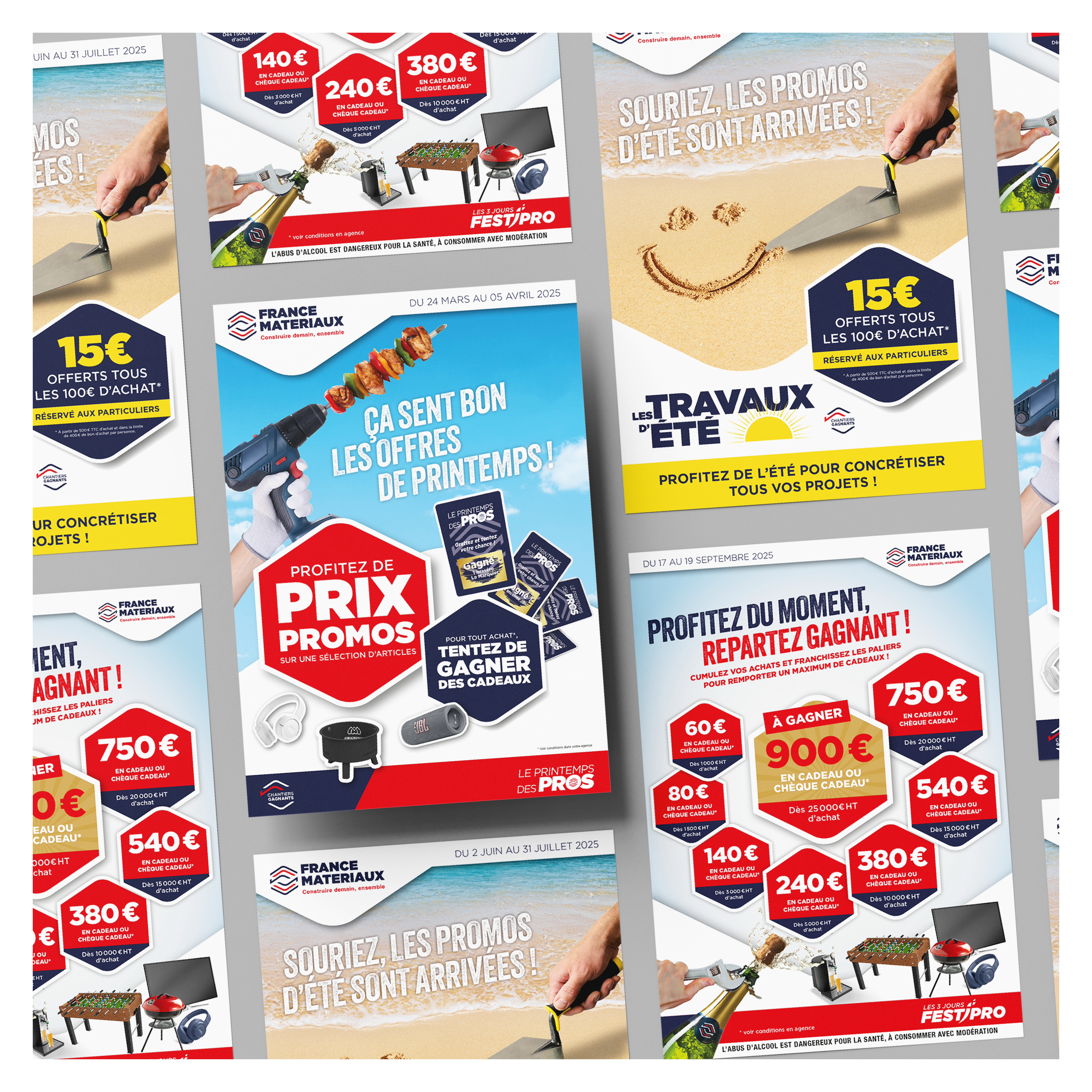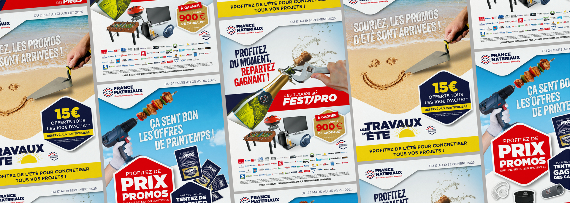 France Matériaux dispose aujourd’hui d’une identité modernisée, cohérente sur l’ensemble de son réseau, et d’un plan d’animation commerciale structuré et différenciant. Grâce au concept « Chantiers Gagnants », les opérations promotionnelles prennent une nouvelle dimension : elles deviennent des rendez-vous attendus, porteurs de business et de visibilité, pour les adhérents comme pour leurs clients. L’enseigne affirme ainsi sa capacité à concilier efficacité commerciale et communication de marque.